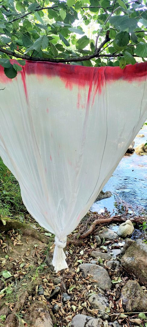 Den perfekten Arbeitsplatz fand ich am Fluss, ein paar Schritte von meiner Wohnung entfernt, im Schatten einer kleinen Buche, deren Arm die Leinwand für mich hielt, ich schöpfte Wasser aus dem Fluss zum Verdünnen der Farben, Wind und Wärme trockneten sie schnell. Ein perfektes Zusammenwirken der Elemente Feuer Wasser Luft und Stoff. Und ich, die Künstlerin, die Netzwerkerin der Elemente und dem Hier und Jetzt…